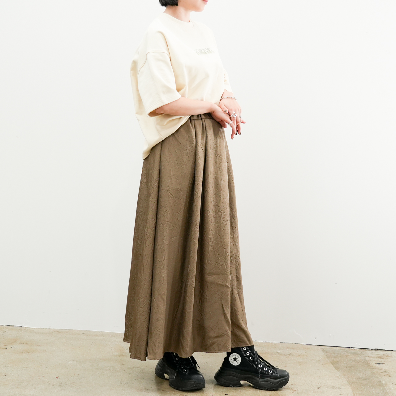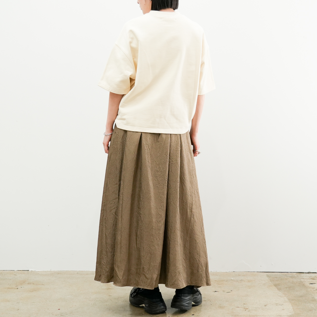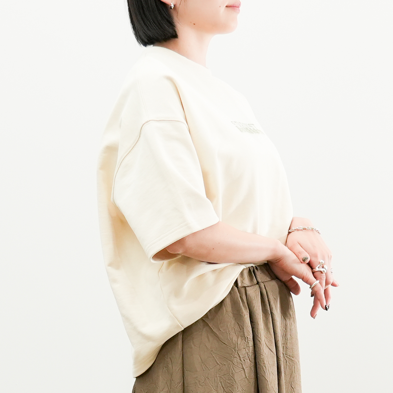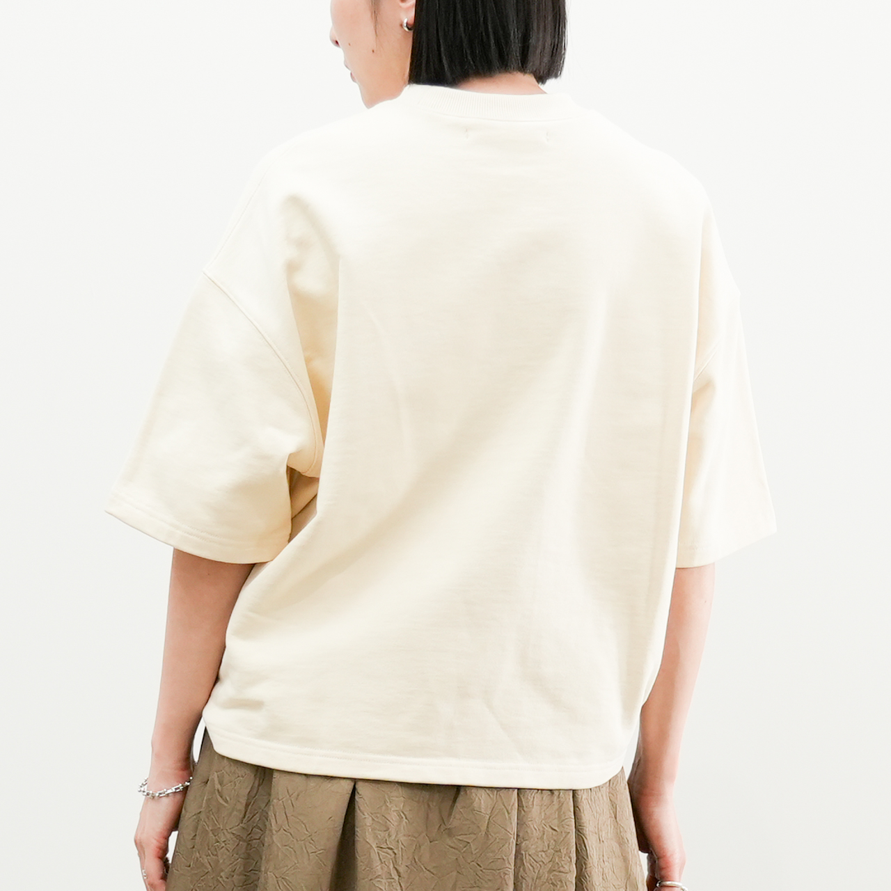 ゆったりとした身幅とドロップショルダーのリラックスシルエットが、抜け感のある大人カジュアルにぴったり。