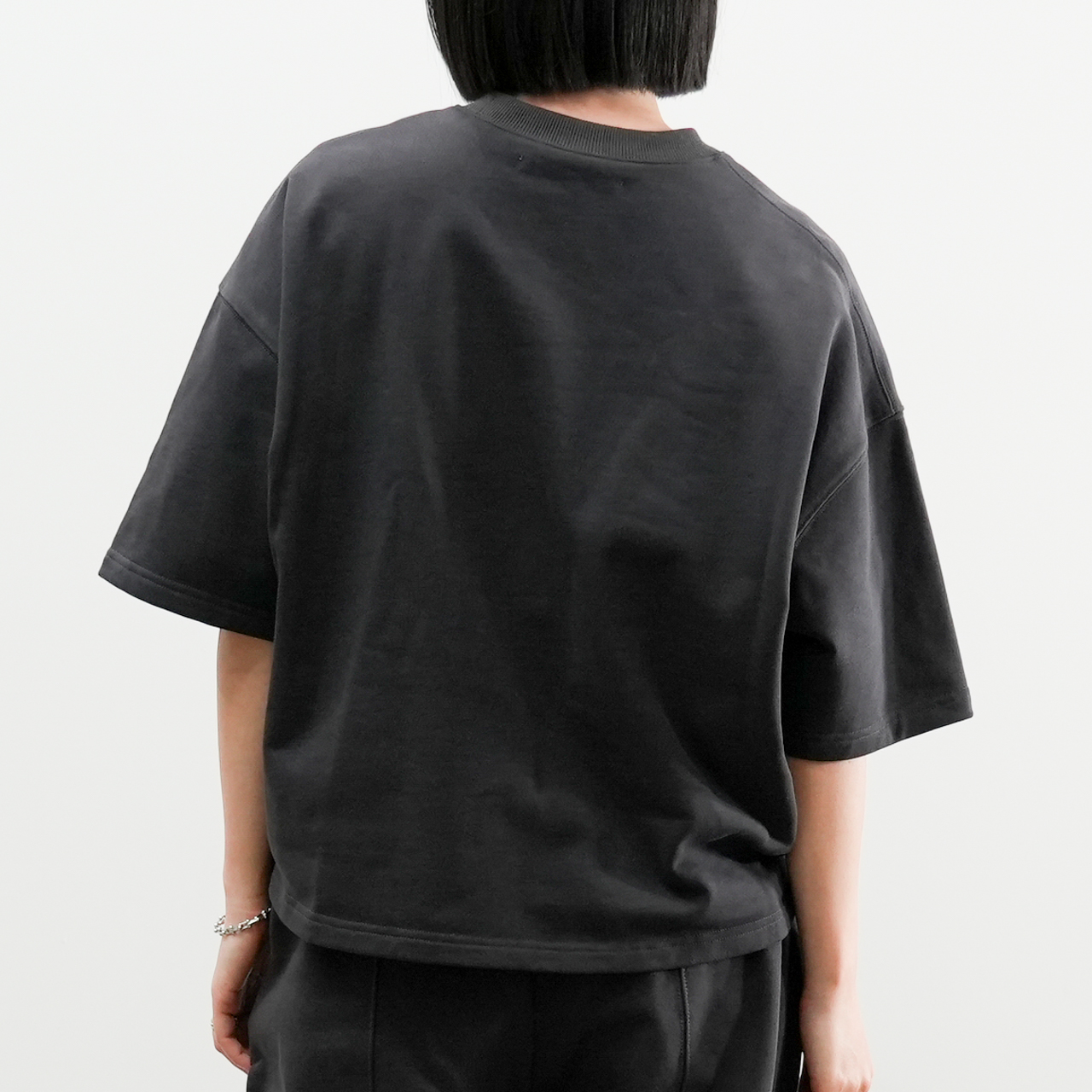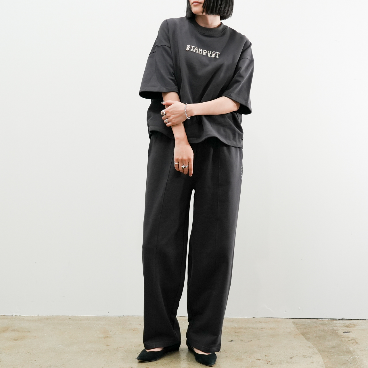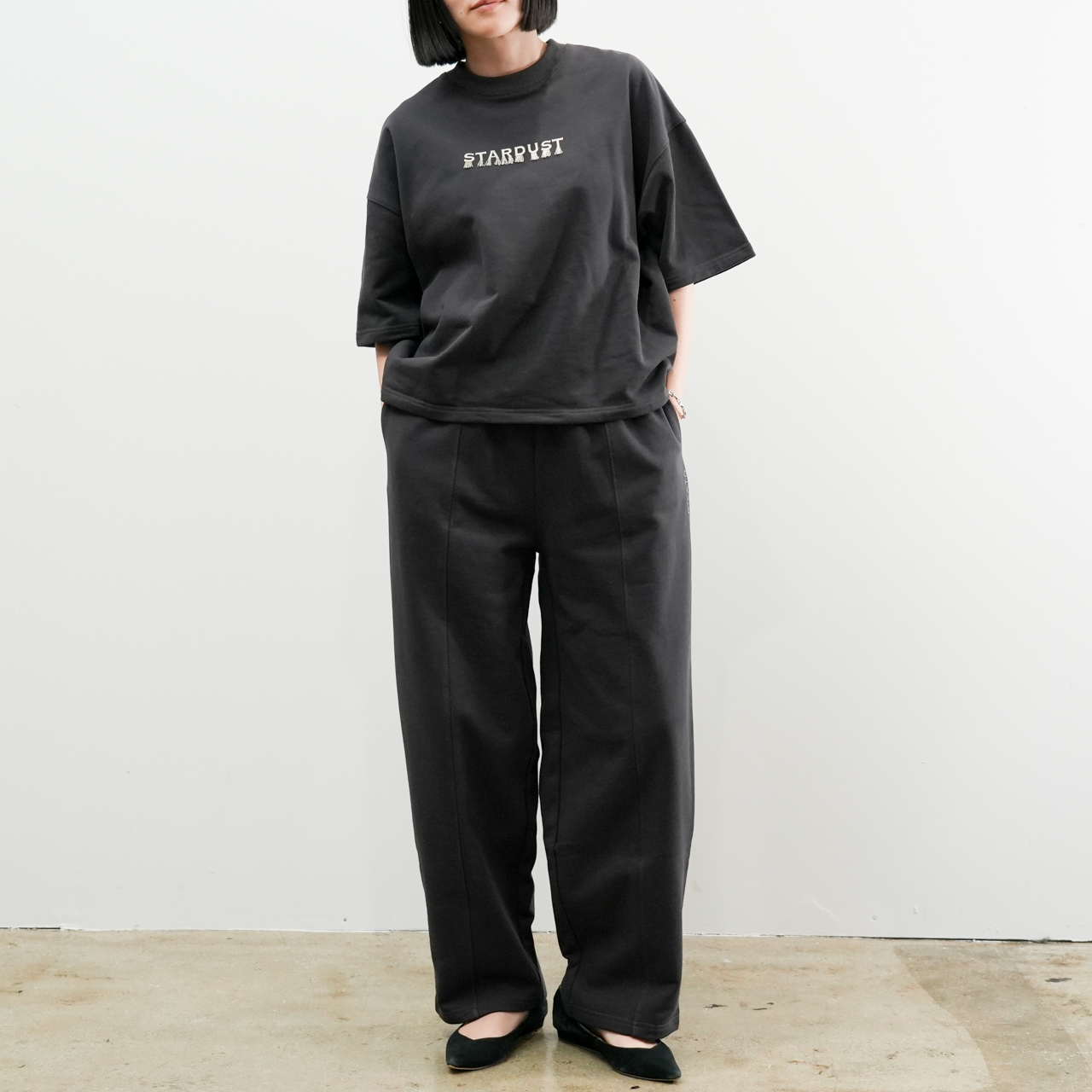 同素材の「カーブスウェットパンツ」とのセットアップスタイルもおすすめ。