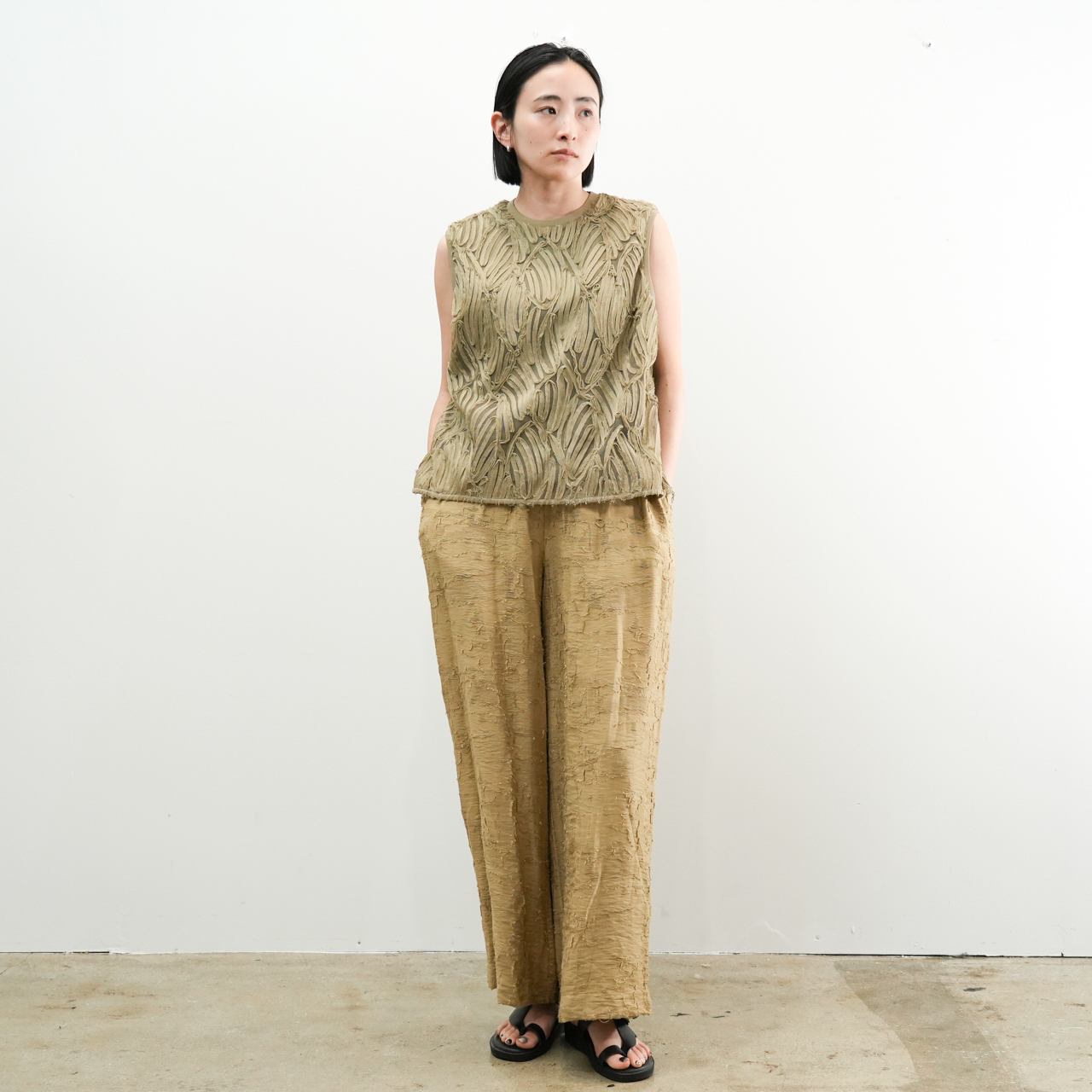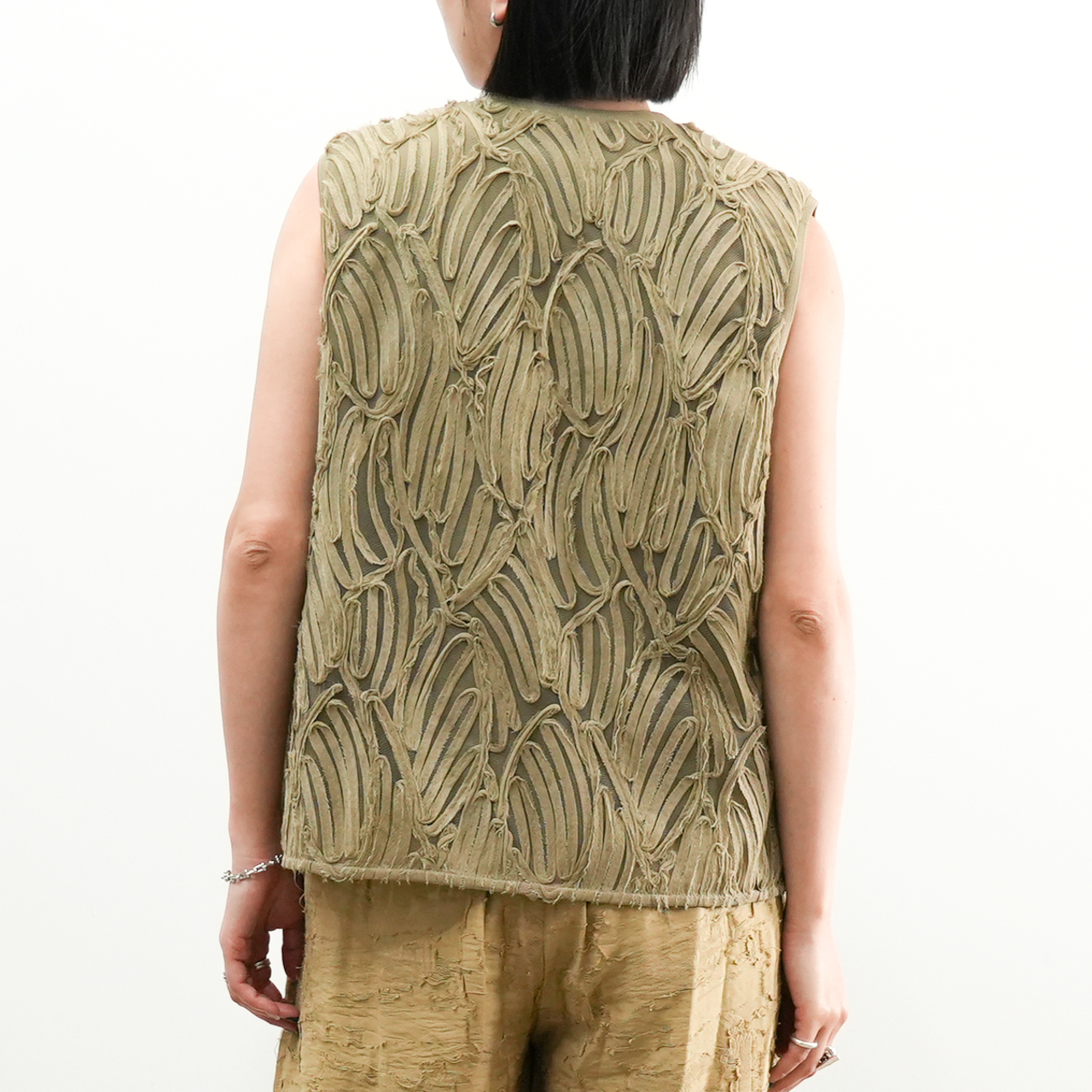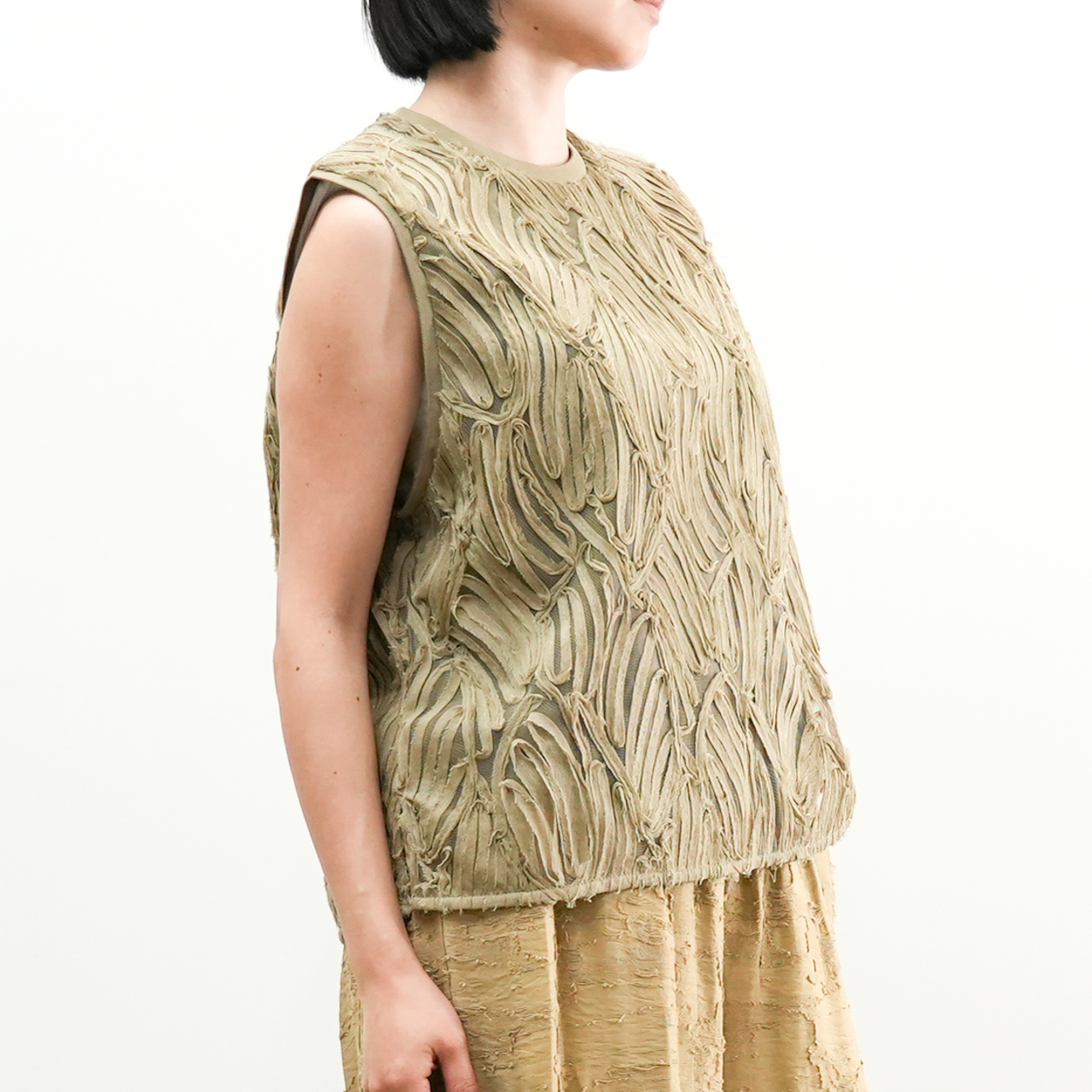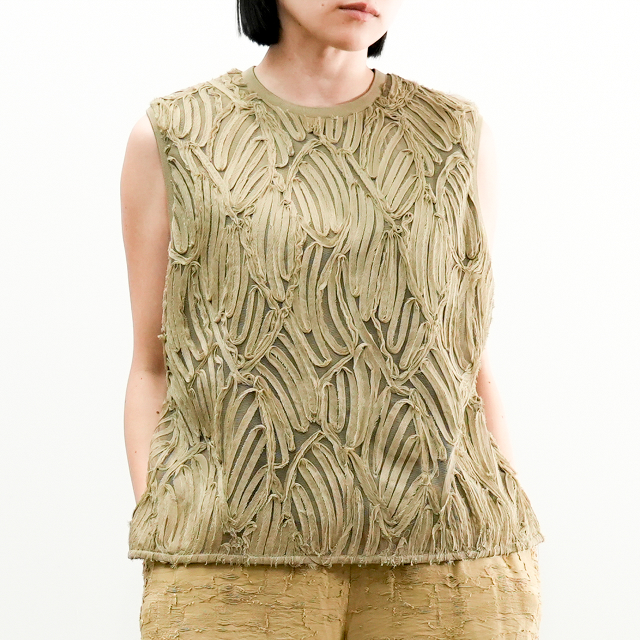 立体感たっぷりの刺繍デザインが目を惹く、存在感のあるノースリーブトップス。