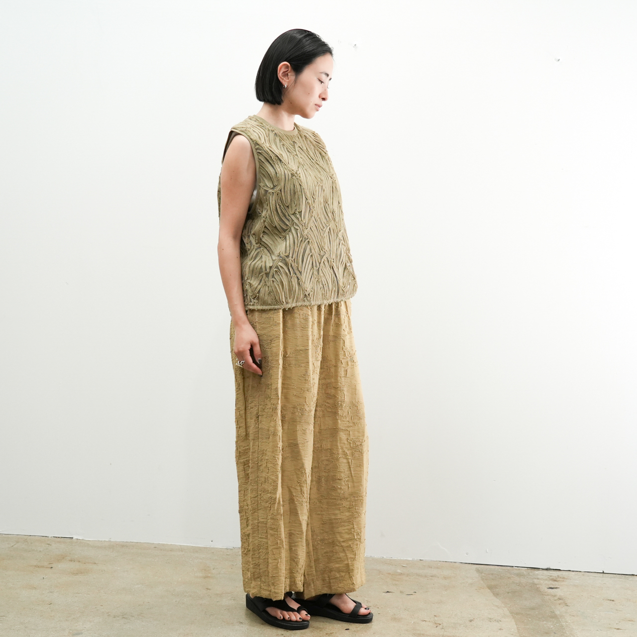 全体にあしらわれたコード刺繍が動きに合わせて揺れ、着るだけでこなれた印象に。