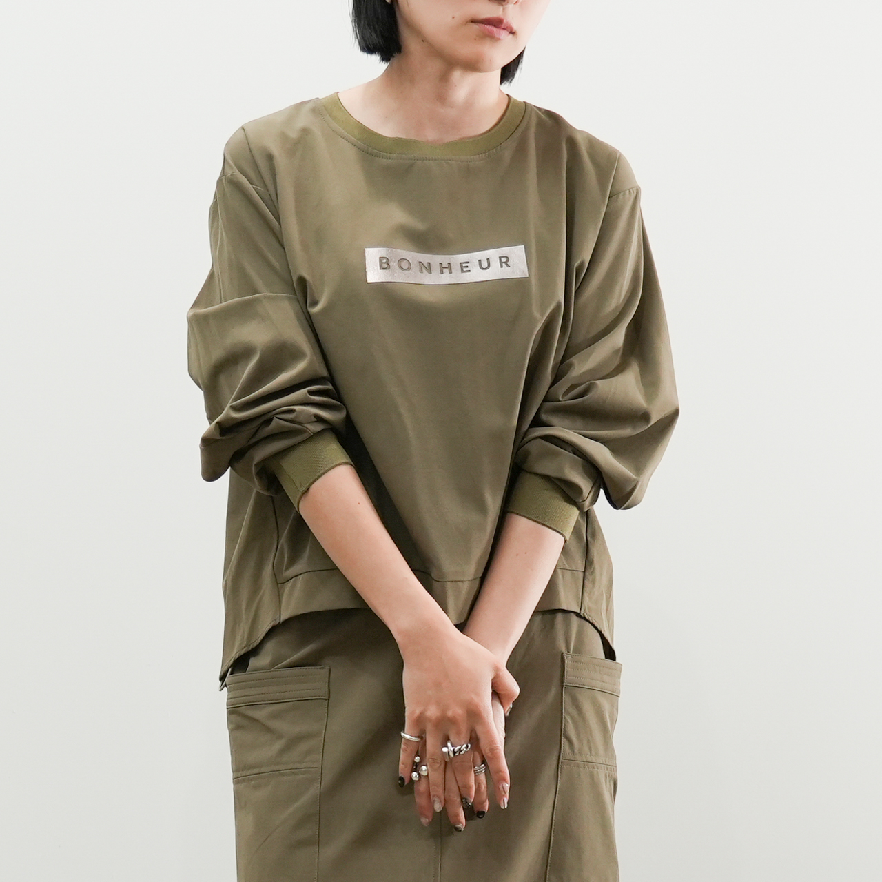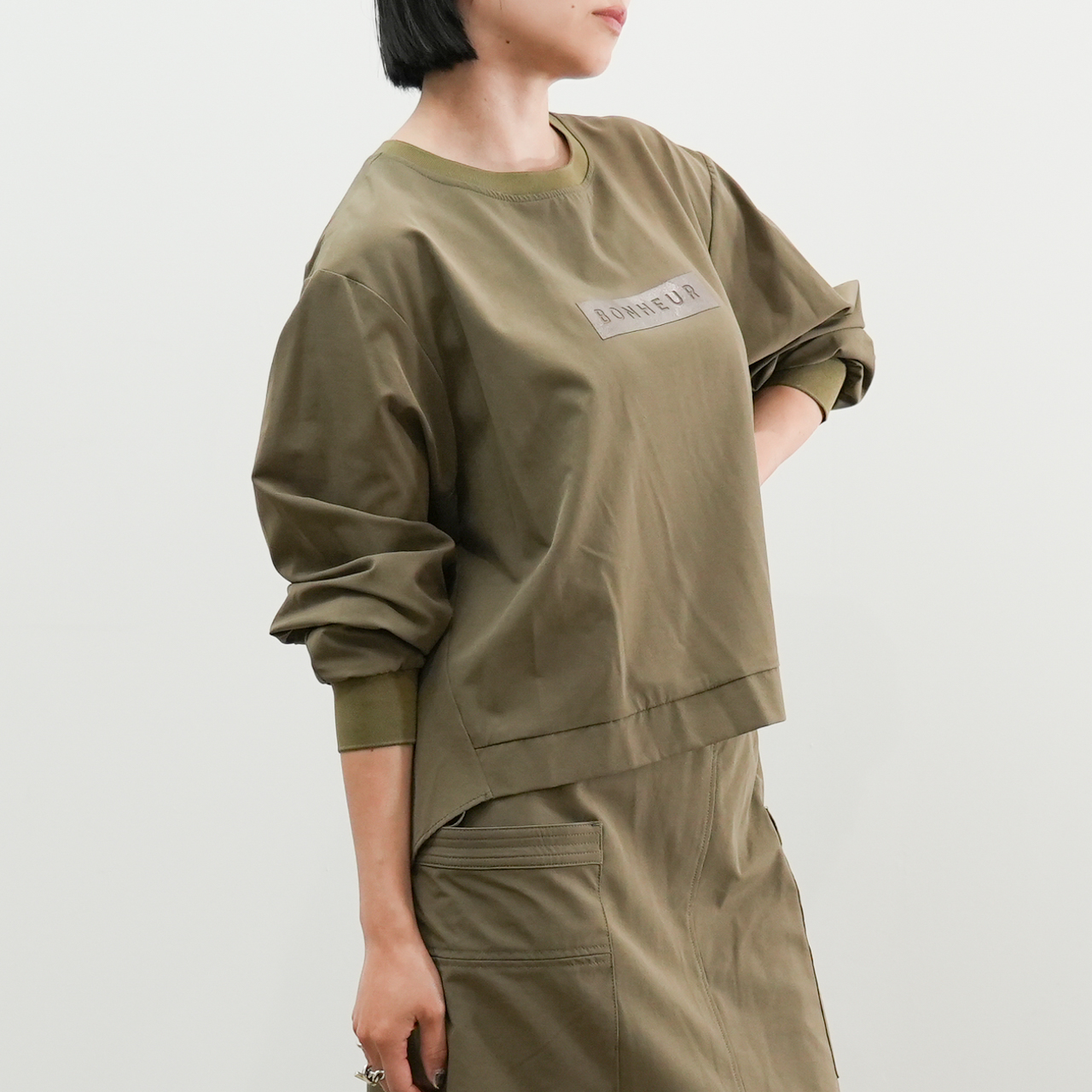 胸元にあしらった合皮パッチの「BONHEUR(=幸せ)」ロゴが、シンプルな中にもさりげない存在感を与えてくれる一着です。