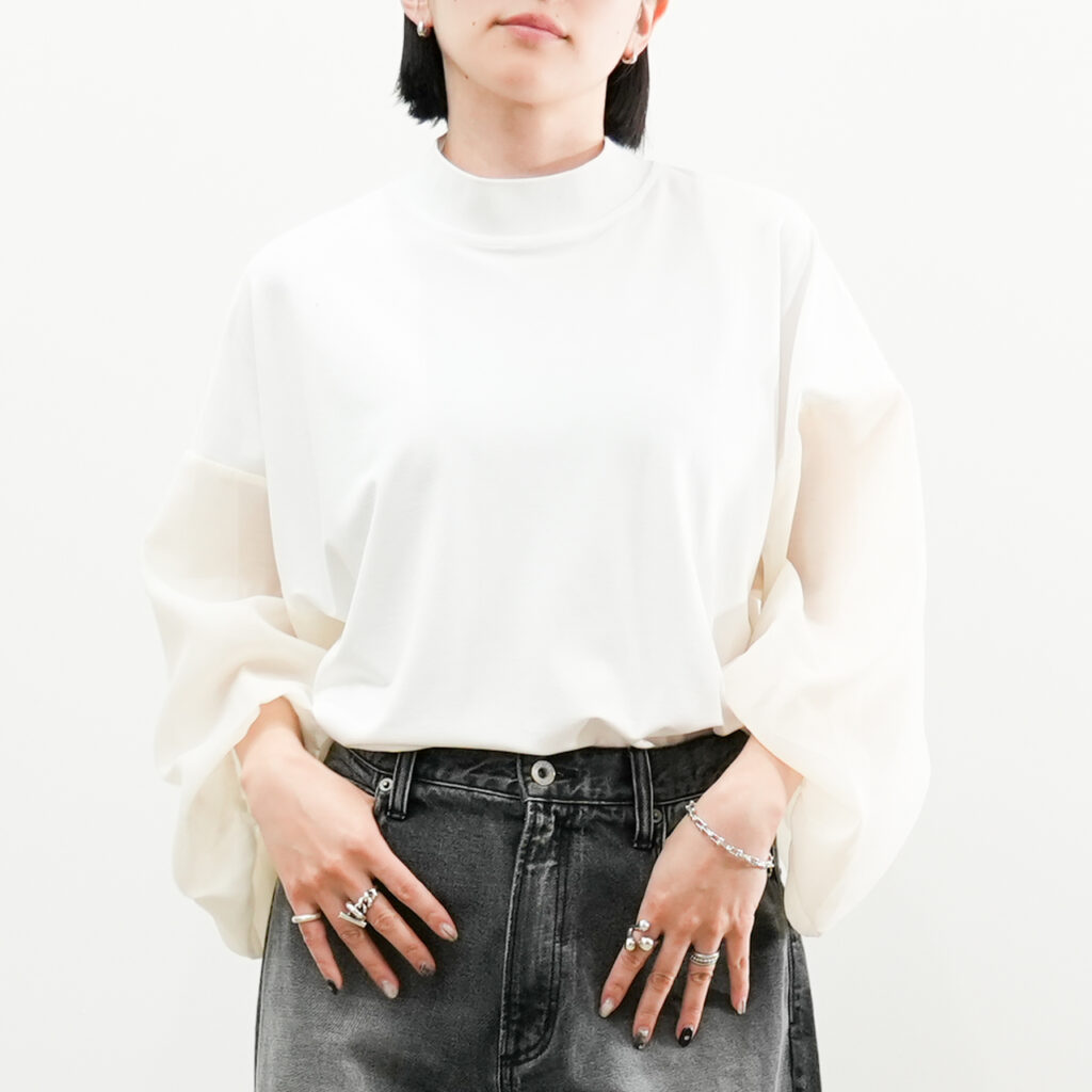袖にはオーガンジーを採用。透け感のある素材が光をやわらかく取り込み、ふんわりと広がるボリュームが女性らしいニュアンスを引き出します。シンプルなスタイリングにプラスするだけで、いつもの日常が少し特別な印象に。